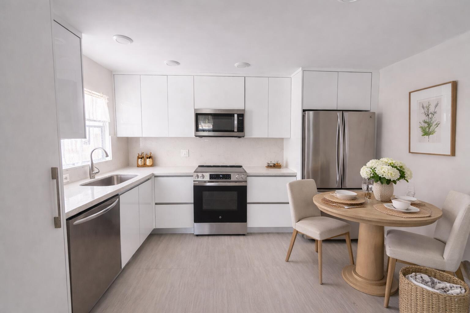 The brand new modern kitchen showcases sleek white cabinetry, stainless steel appliances, and clean minimalist lines. Enjoy indoor outdoor living from the screened patio, which includes a full size washer and dryer with additional storage.