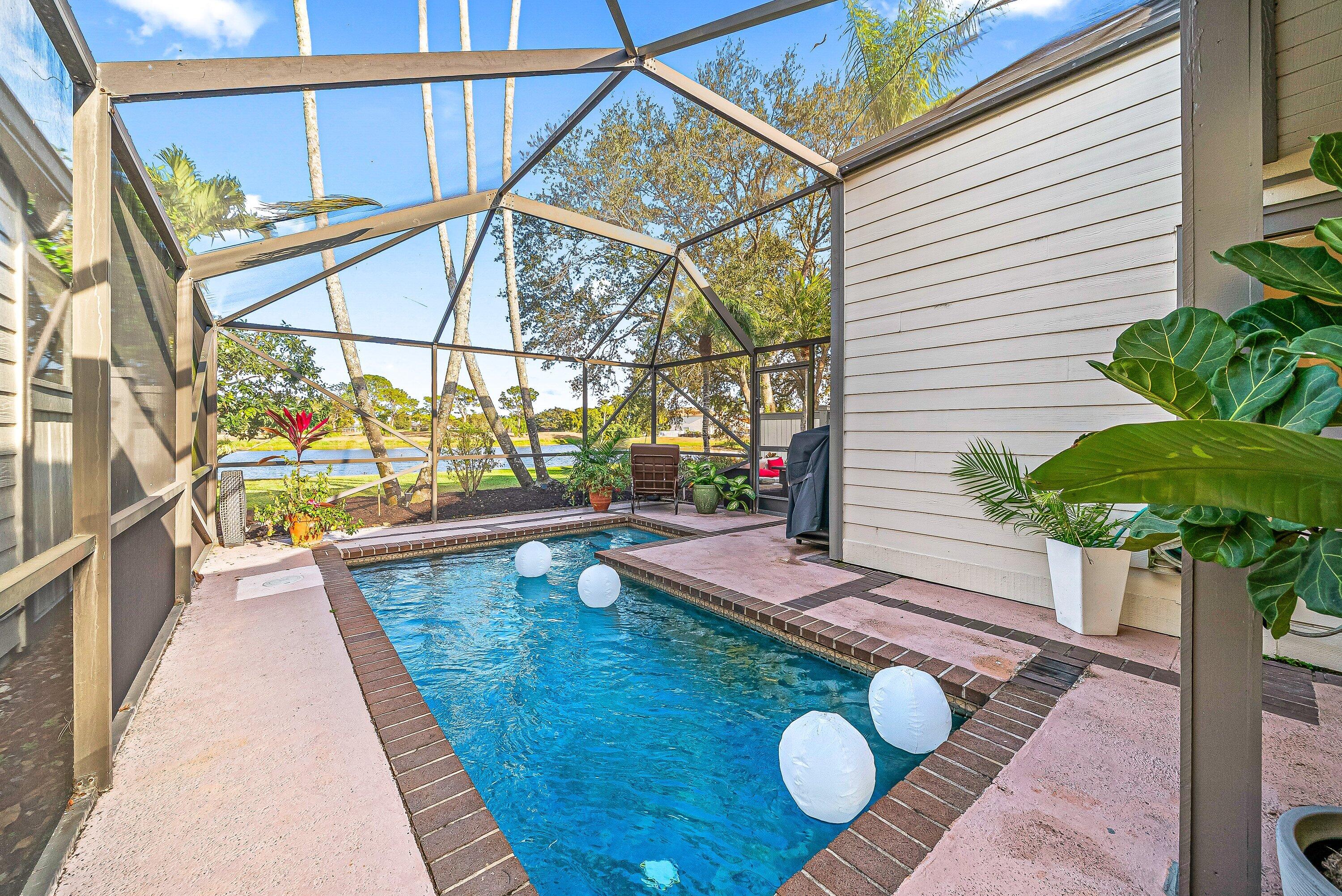 NEW roof in June of 2025, updated kitchen and baths with hardwood floors, popcorn ceiling removed throughout. This unit also has a private pool with screen enclosure boasting lake views and another outdoor patio and yard beyond that can be fenced.