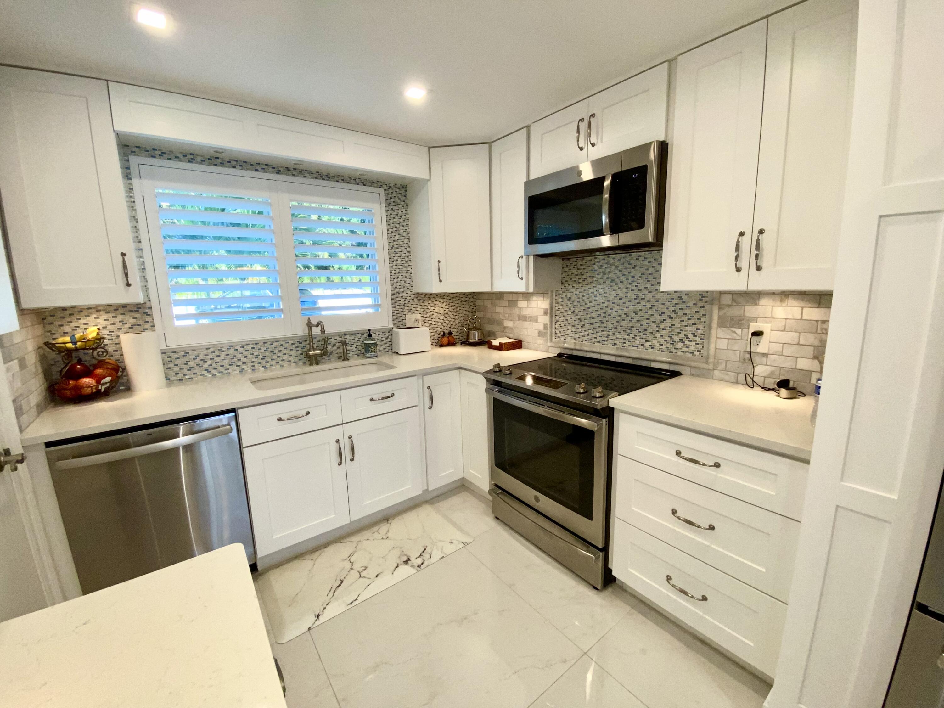 Features a stylish, remodeled kitchen with stainless steel appliances, quartz countertops, and modern cabinetry optimal for everyday living and entertaining. The open living and dining areas showcase oversized porcelain tile flooring, creating a bright and elegant coastal contemporary feel throughout the home.